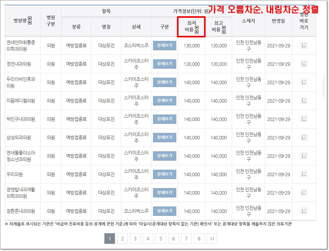 위와 같이 검색 결과에서 최저비용에 있는 화살표를 클릭하면 최저비용 오름차순 내림차순으로 정렬이 됩니다. 인천 남동구에서는 연세안마취통증의학과의원에서 조스타박스 백신이 13만 원으로 가장 저렴한 것임을 확인하실 수 있습니다. 해당 병원의 상세보기 버튼을 누르면 좀 더 상세한 지도와 주소를 확인하실 수 있습니다.