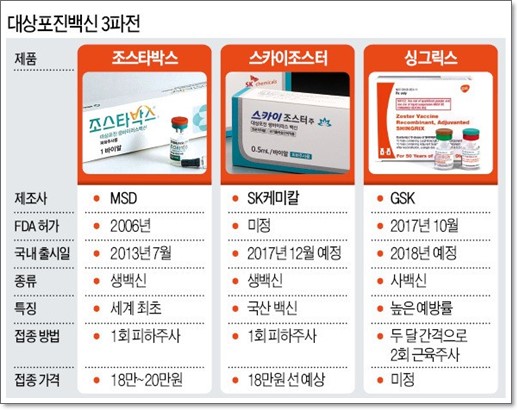 스카이조스터 역시 50세 이상 성인 대상포진 예방 백신으로 우리나라의 SK케미칼에서 만든 국내 백신입니다. 이 역시 생백신으로 1회 접종으로 마무리됩니다. 상대적으로 수입 백신인 조스타박스에 비해 가격이 저렴한 편입니다. 참고로 사백신(균을 비활성화 시킨 백신) 싱그릭스가 있는데, 아직 우리나라에는 들어와있지 않습니다.