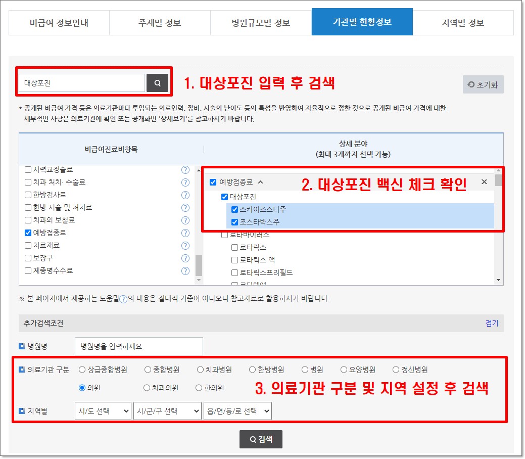 대상포진 예방접종 가격은 대략 10만 원에서 최고 20만 원 내외까지로 병원에 따라 가격 편차가 큰 편입니다. 사전에 병원에 문의해보시고 가시거나 아래의 링크를 통해 비급여 진료비 정보를 확인하신 후 방문하는 것이 좋습니다. 대상포진 예방접종 가격 검색하는 방법은 아래 이미지를 참고하시기 바랍니다.