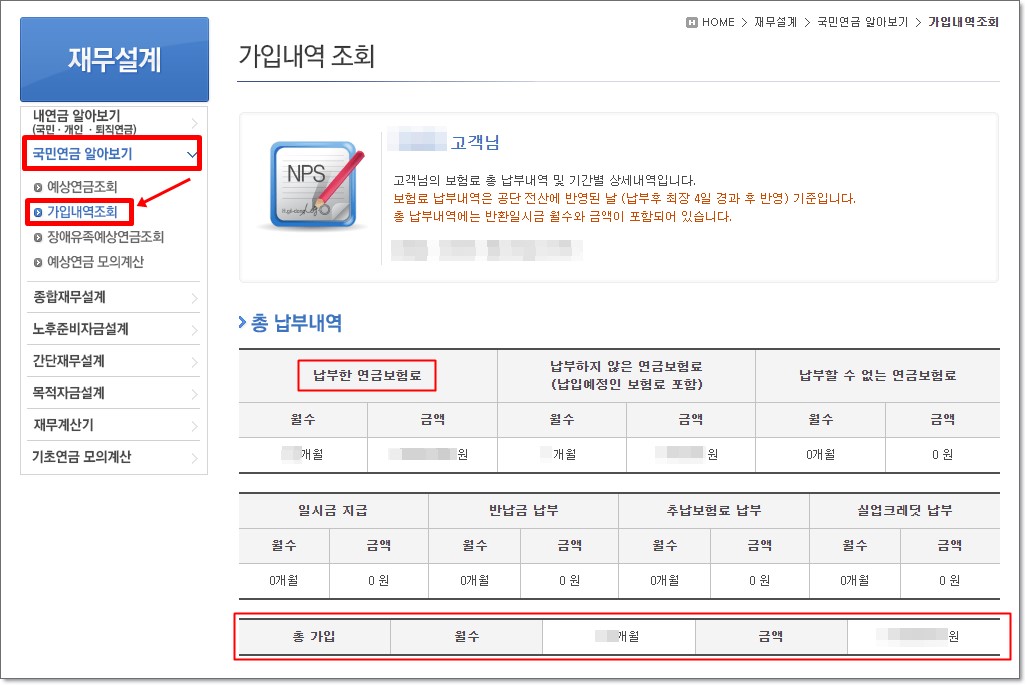 좌측의 메뉴에서 가입내역조회를 선택하시면 나의 국민연금 납부 내역을 좀 더 상세하게 확인하실 수 있습니다. 언제부터 납부하기 시작하여 지금까지 몇 개월을 납부했으며, 총 얼마의 금액을 납부했는지 상세하게 확인할 수 있습니다.