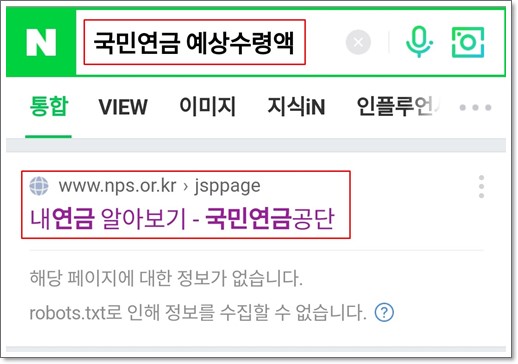 모바일에서 진행을 하신다면 '국민연금 예상수령액'을 검색하시면 아래와 같이 '내연금 알아보기' 사이트가 뜹니다. 여기에서 바로 아래와 동일하게 진행하실 수 있습니다.