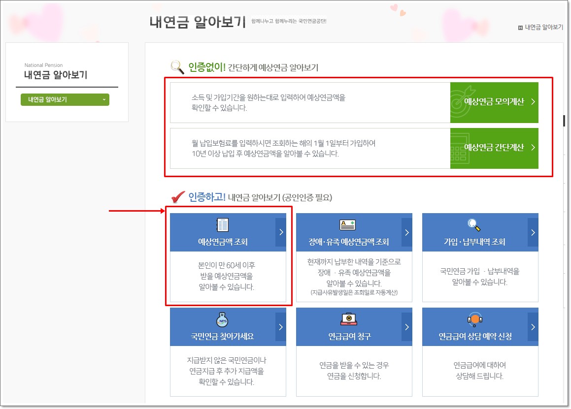 우리의 노후가 걸려있는 중요한 연금인데 정확하게 아는 것이 중요합니다. 아래쪽에 파란색 메뉴로 되어 있는 곳을 보시면 '예상연금액 조회' 메뉴가 있습니다. 여기서부터는 로그인 인증이 필요하기 때문에 정확하게 국민연금 수령액을 확인할 수 있습니다.