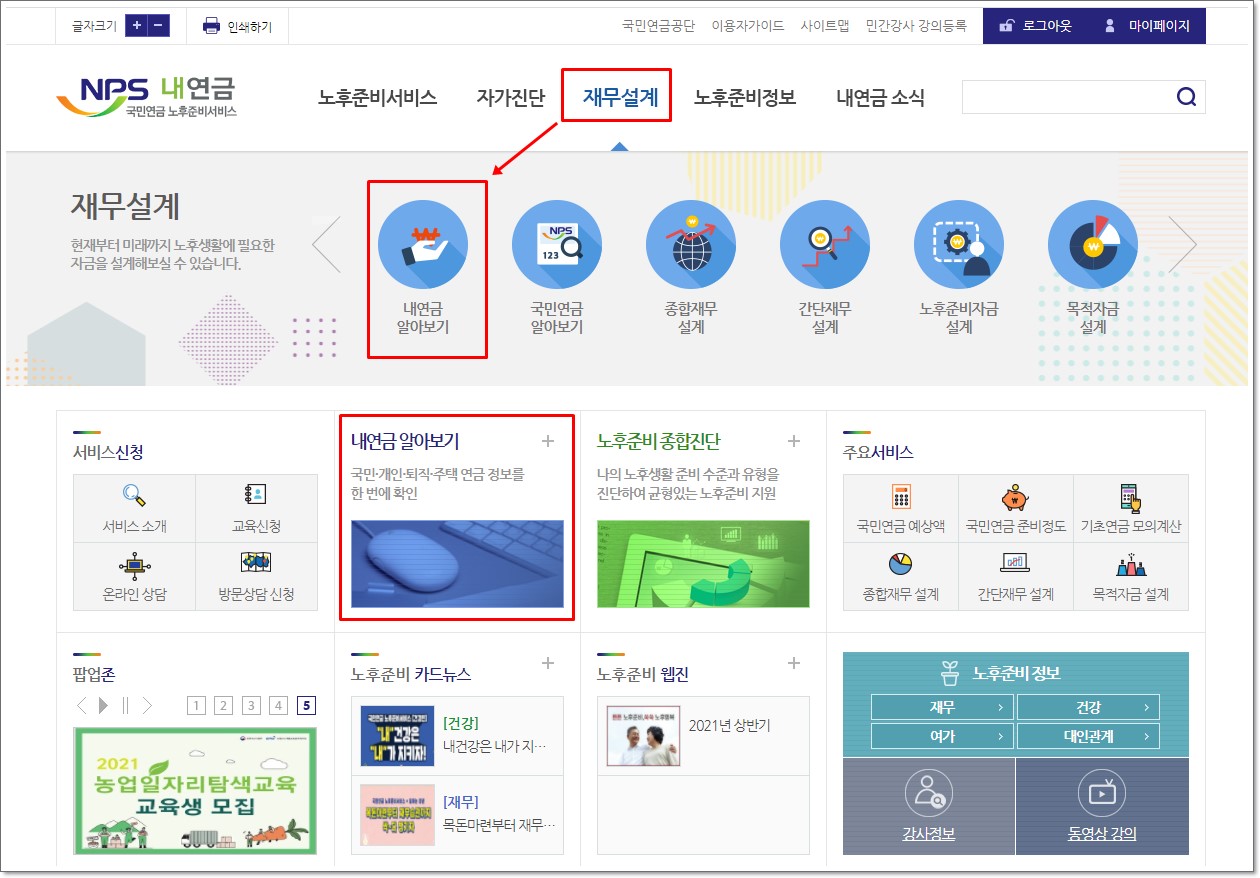 참고로 네이버, 카카오 인증을 하면 홈페이지 메인화면으로 돌아갑니다. 이때 놀라지 마시고 아래 이미지 참고하여 내연금 알아보기 메뉴를 클릭하신 후 나오는 페이지에서 좌측의 국민연금 알아보기 메뉴를 클릭하시면 위의 이미지와 동일하게 예상 노령연금액을 확인하실 수 있습니다.