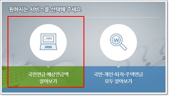 예상연금액 조회 메뉴를 클릭하면 국민연금 예상연금액 알아보기와 국민·개인·퇴직·주택연금 모두 알아보기 메뉴 2개가 보입니다. 둘 중에 왼쪽에 있는 국민연금 예상 연금액 알아보기를 클릭하시면 로그인 화면으로 이동합니다.