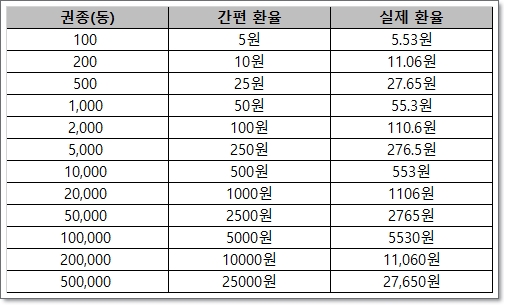 물론 정확하게 계산하면 글 작성일자 기준 11,060원이 됩니다. 즉, 정확하게는 18 정도로 나누어야 하지만, 20으로 나눠도 크게 차이가 없기 때문에 그냥 편하게 대략 20으로 나누어서 계산하시면 됩니다. (2023년 3월 25일 기준 100동=5.53원)